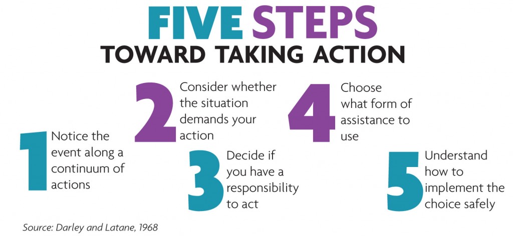 As a peer health educator, I wish to challenge myself to ignore the instincts of going with the flow and instead be the one to set out on a path different from the rest. I strive to be the type of person you see giving the homeless man a bagel from the Dunks around the corner. Although, there are times where stepping in seems a little intimating, and out of your comfort zone, and this is okay. Not everyone can jump into action. But, there are things anyone can do. When presented with something that is not right, such as a fight, one can follow these intervening guidelines: Be ready, identify the behavior (not the person), appeal to moral principles, set limits for yourself being involved, find allies around you, and be persistent.